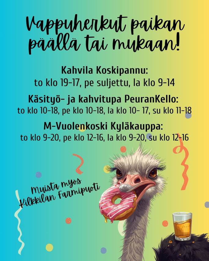 Mikäli munkkien paistaminen ei kuulosta houkuttelevalta, vapun sokerisia herkkuja on mahdollista ostaa omalta kylältä. Katsoppa tästä vinkit: