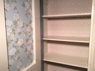 Keittiön kaapit kunnostin maalin ja edullisten tapetinjämien innoittamana (kotimaiset aidot