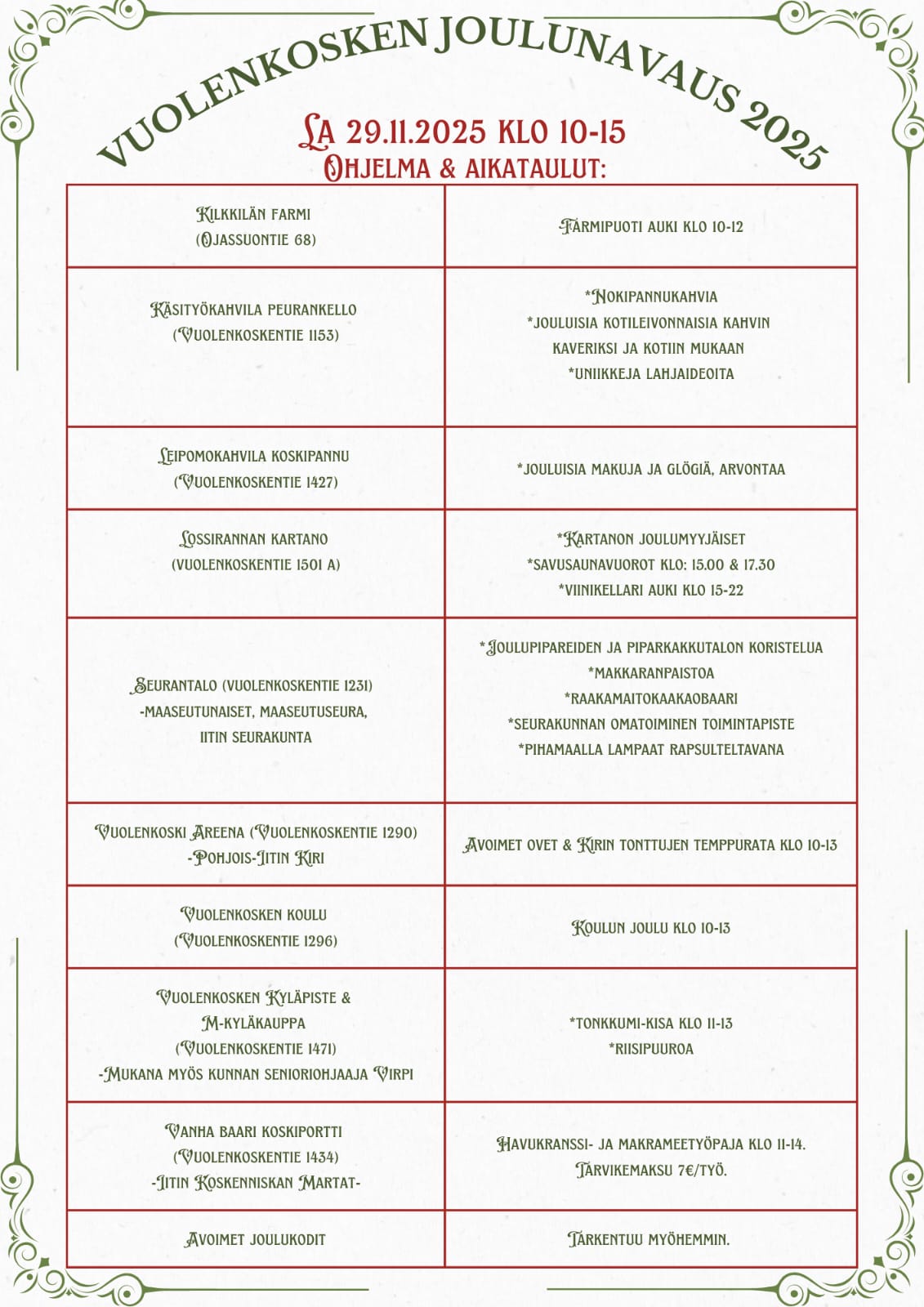Koko kyläalueen yhteistä ja ihka ensimmäistä joulunavausta vietetään lauantaina marraskuun 29. päivä.