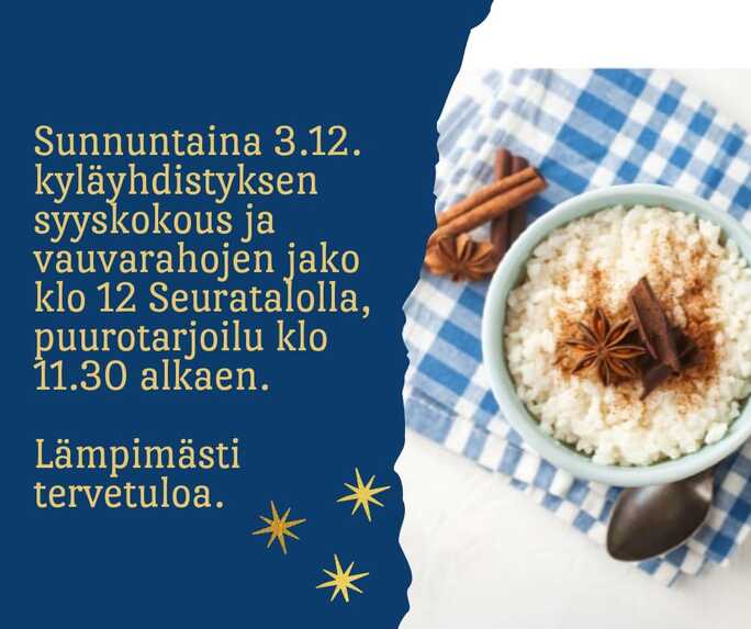 Kaikille avoin Vuolenkosken kyläyhdistyksen sääntömääräinen syyskokous su 3.12. klo 12 Vuolenkosken seuratalolla. Puurotarjoilu klo 11.30 alkaen. Tilaisuus avataan kuluvan vuoden vauvaperheitä muistamalla.